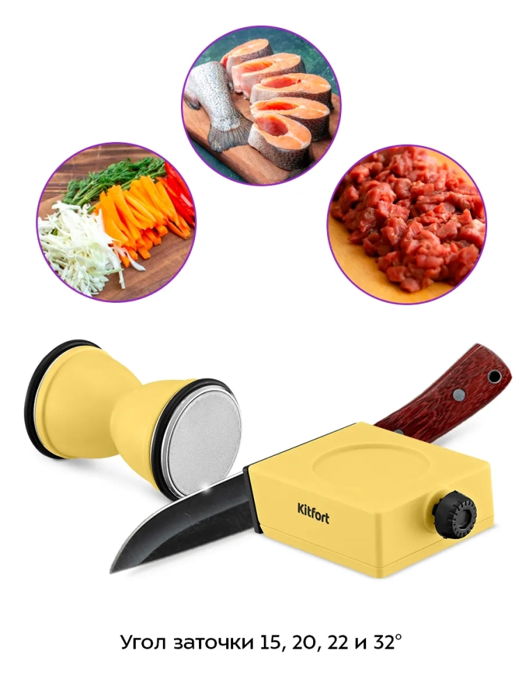 Важное значение в заточке лезвия играет заданный угол заточки. От угла зависит степень остроты заточки. Чем меньше угол заточки — тем острее будет нож, однако приходить в негодность он будет быстрее. Варьируются значения угла заточки от 10° до 60°. В данной точилке можно заточить ножи под углом 15°, 20°, 22° или 32°. Угол заточки ножа 15° используется для нарезки мяса и мягких продуктов. Углы заточки в 20° и 22° считаются универсальными для кухонных ножей, а угол 32° подходит для разделочных ножей.