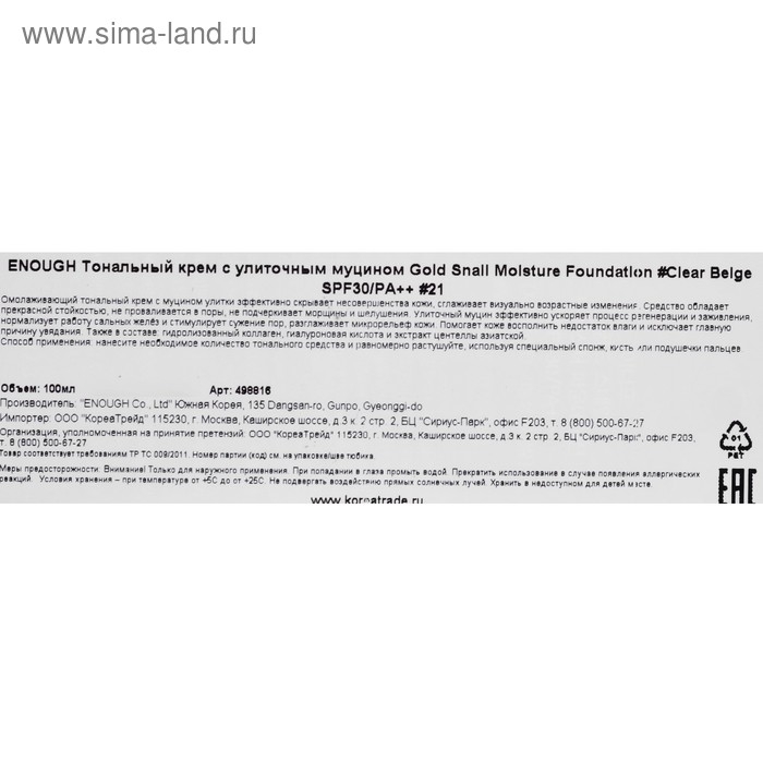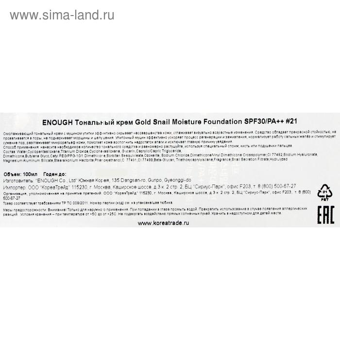 Тональный крем с улиточным муцином Enough Gold Snail Moisture Foundation, SPF30, тон прозрачный бежевый, 100 мл