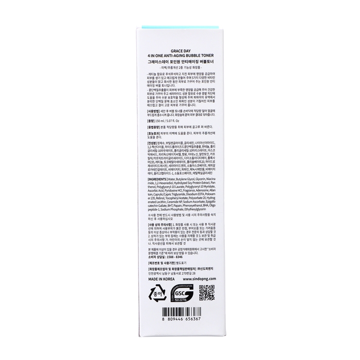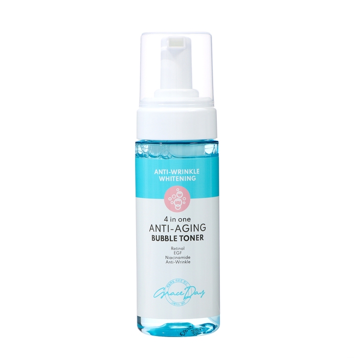Антивозрастной пузырьковый тонер для лица Grace Day 4 in one anti-aging bubble toner оказывает выраженное омолаживающее воздействие, восстанавливает гладкость, упругость, эластичность эпидермиса. Специальный комплекс 4 в 1 (ретинол, пептиды, керамиды, ниацинамид) разглаживает кожу, улучшает цвет лица, корректирует неровный тон, обеспечивает мощное клеточное обновление. Благодаря необычайно легкой воздушной текстуре, тонер моментально впитывается, ощущение свежести, увлажненности остается надолго, идеально подходит для кожи с возрастными изменениями.
