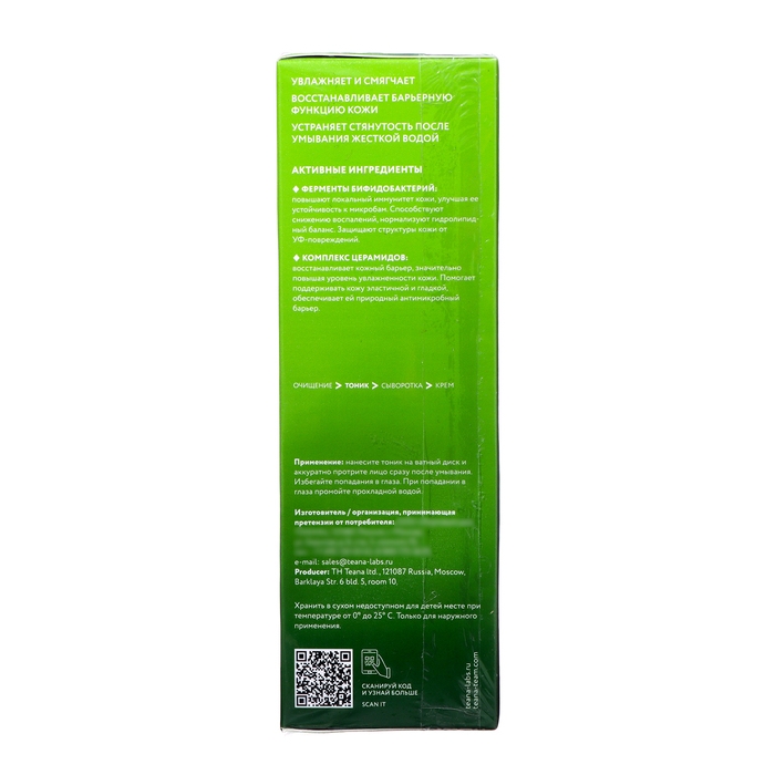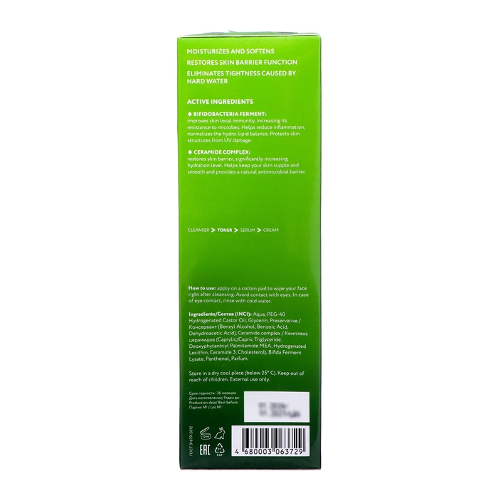 Тоник для лица с церамидами и ферментами бифидобактерий увлажняет и смягчает, восстанавливает барьерную функцию кожи и устраняет стянутость после умывания жесткой водой.