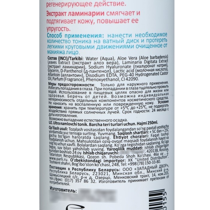 Состав: Water (Aqua), Aloe Barbadensis Leaf Extract (экстракт алоэ), Laminaria Digitata (Horsetail Kelp) Extract (экстракт ламинарии), Sodium Hyaluronate, Polysorbate-20 (Polyoxyethylene Sorbitan Monolaurate), D-Рanthenol, Lactic Acid, Allantoin, Tetrasodium EDTA, Parfum (Fragrance), Methylchloroisothiazolone, Methylisothiazolone, CI 42090.