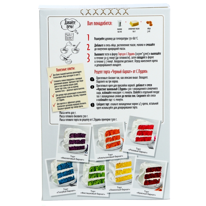 Чёрный цвет считается загадочным и благородным, он всегда актуален и никогда не выходит из моды. В последнее время этот цвет из сферы моды всё чаще проникает в другие сферы деятельности человека. Сегодня он завоевывает кондитерское искусство. Насыщенный глубокий цвет нашего торта обеспечен натуральными красителями, а нежный вкус коржей тщательно проработанной рецептурой. Мы уже всё продумали за вас, поэтому вам нужно объединить все ингредиенты, испечь коржи и украсить торт любимым кремом. Особенно эффектно на контрасте выглядит белый крем, взбитые сливки. Вы можете использовать ванильный фростинг «С.Пудовъ» или любой крем, который вам понравится.