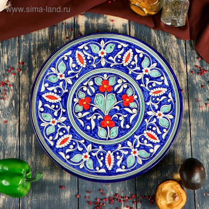 Тортовница Риштанская Керамика "Цветы", 31 см, синяя