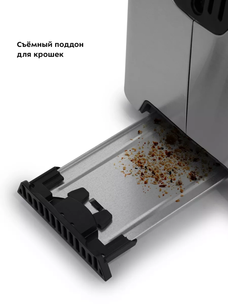 Снизу расположен съемный поддон для крошек, поэтому чистить тостер просто и удобно.