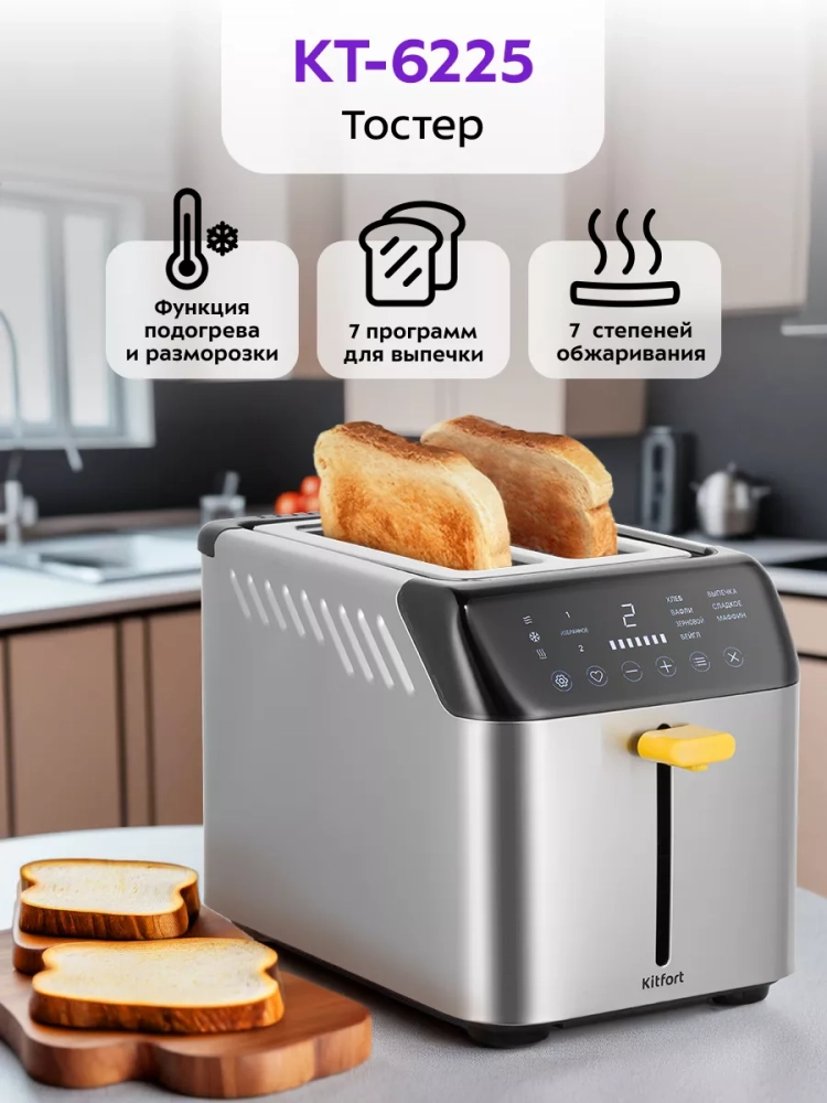 Электрический тостер Kitfort KT-6225 создан для тех, кто любит полакомиться ароматным и хрустящим горячим поджаренным хлебом. Особый вкус и цвет корочки тостов получаются такими благодаря карамелизации сахара, содержащегося в муке, при инфракрасном нагреве в процессе приготовления.