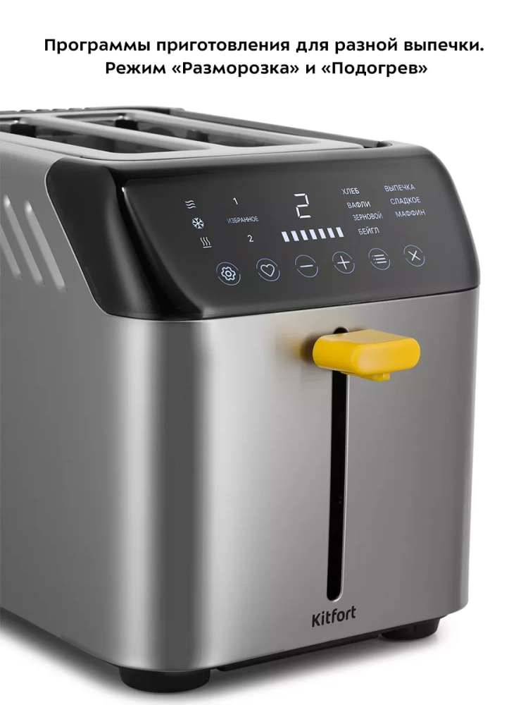 Тостер оснащен цифровым дисплеем с сенсорными кнопками. Режим подогрева служит для подогрева уже готовых тостов, если они остыли. Режим разморозки позволяет приготовить тосты из замороженного хлеба. Также тостер оснащен семью программами для обжаривания разных мучных изделий: «Хлеб», «Вафли», «Зерновой», «Бейгл», «Выпечка», «Сладкое» и «Маффин». Программы отличаются временем приготовления, так как разную выпечку необходимо поджаривать разное время, чтобы получить желаемую степень обжарки. Программа «Бейгл» позволяет обжарить выпечку только с одной стороны. Выбранный режим, программу и степень обжаривания можно сохранить, чтобы не настраивать снова при следующем использовании.