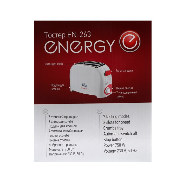 Тостер ENERGY EN-263, 750 Вт, 7 режимов прожарки, 2 тоста, белый
