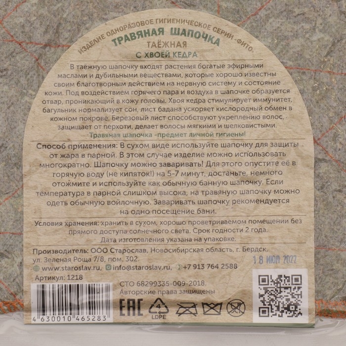 В таёжную шапочку входят растения богатые эфирными маслами и дубильными веществами, которые хорошо известны своим благотворным действием на нервную систему и состояние кожи. Под воздействием горячего пара и воздуха в шапочке образуется отвар, проникающий в кожу головы. Хвоя кедра стимулирует иммунитет, багульник нормализует сон, лист бадана ускоряет кислородный обмен в кожном покрове. Березовый лист способствуют укреплению волос, защищает от перхоти, делает волосы мягкими и шелковистыми. Травяная шапочка - предмет личной гигиены!