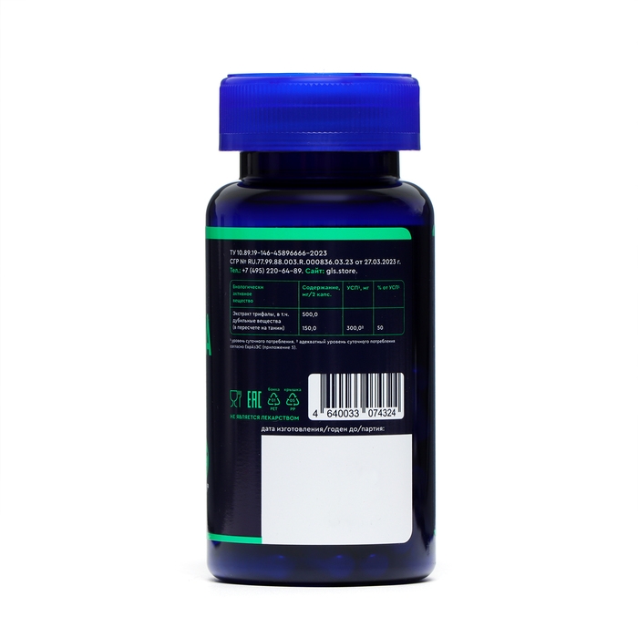Экстракт трифалы (экстракт плодов эмблики, плодов терминалии хебулы, плодов терминалии беллерики) — 500 мг, в т.ч. дубильные вещества, в пересчете на танин — 150 мг.