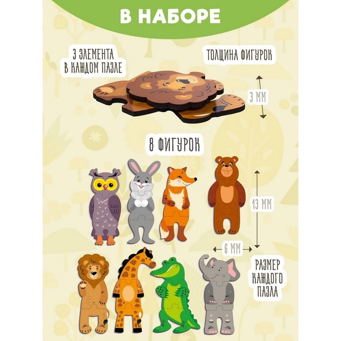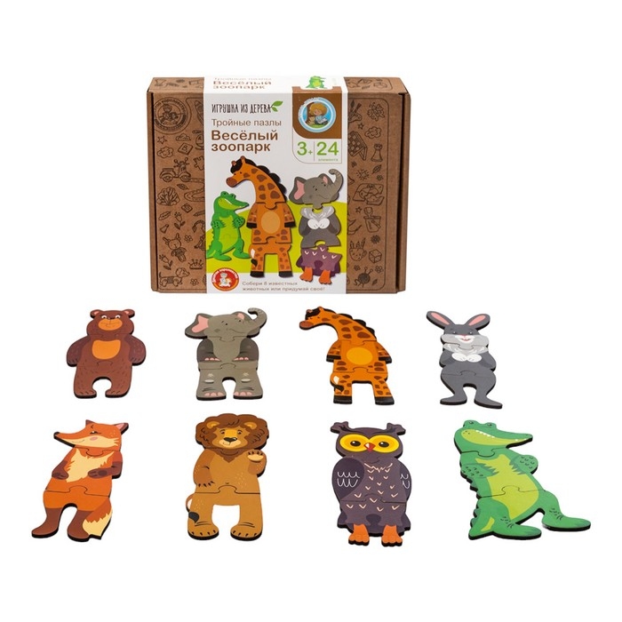 Тройные пазлы «Весёлый зоопарк» – это идеальный набор для развития логики и моторики у детей от 3 лет. Этот яркий и увлекательный комплект состоит из 3 деревянных пазлов, окрашенных в яркие цвета, которые привлекут внимание ребёнка.