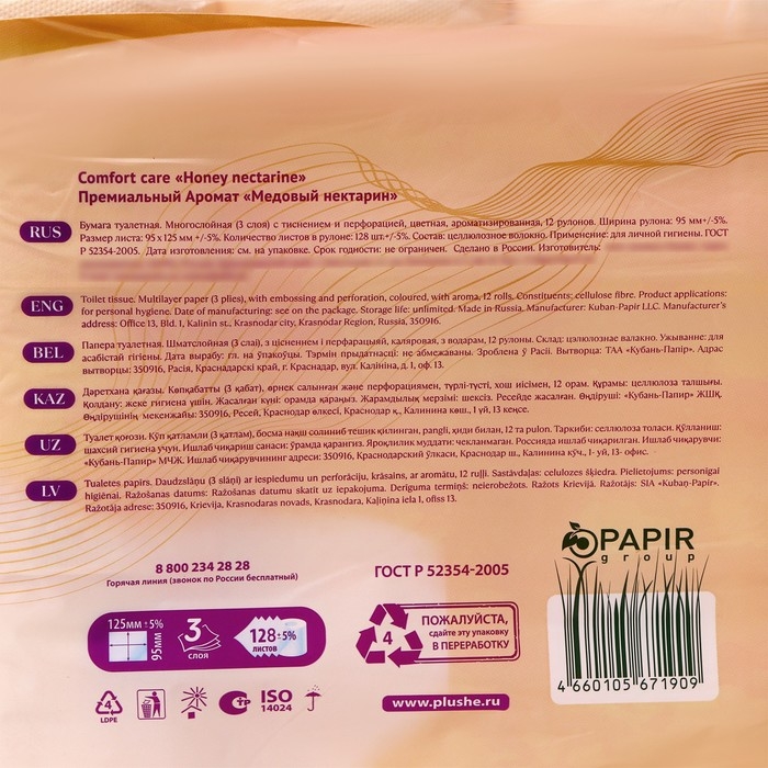 Туалетная бумага линейки Comfort care Honey Nectarine – это трехслойная цветная бумага нежно-бежевого оттенка с премиальным ароматом медового нектарина.