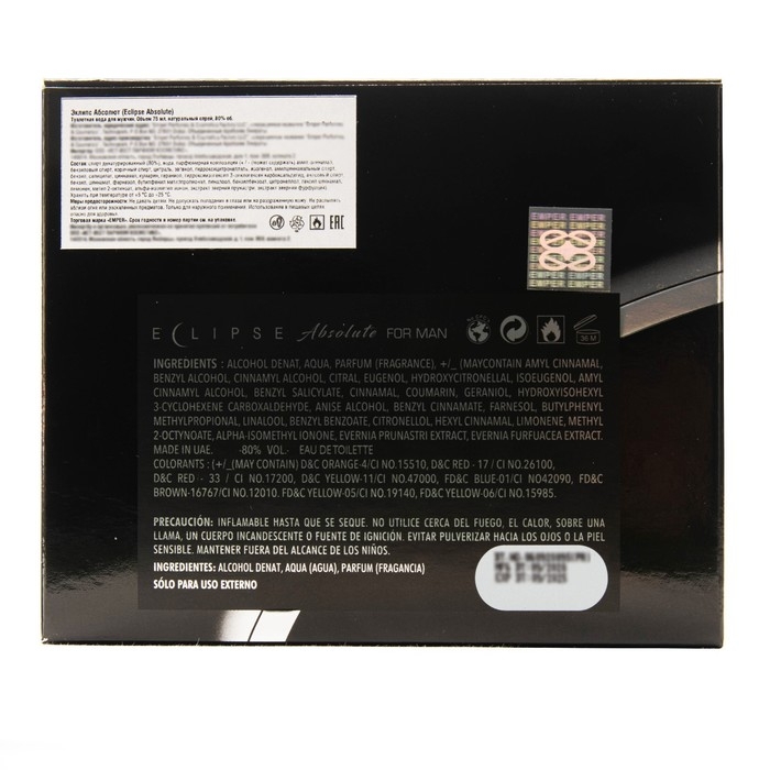 Мелодия от торговой марки Эмпер начинается с искристых нот грейпфрута. На сердце композиции раскрывается теплое взаимодействие нот кедрового дерева и пряных специй. Завершающий шлейф композиции включает в себя мускусные ноты, создавая логическое завершение аромата Eclipse Absolute.