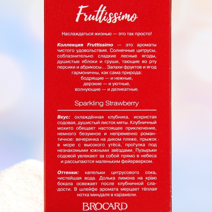 Оттенки: капельки цитрусового сока, чистейшая вода. Долька лимона на краю бокала освежает после клубничной сладости. В шлейфе аромата мерцает тёплая нота миндаля в карамели.