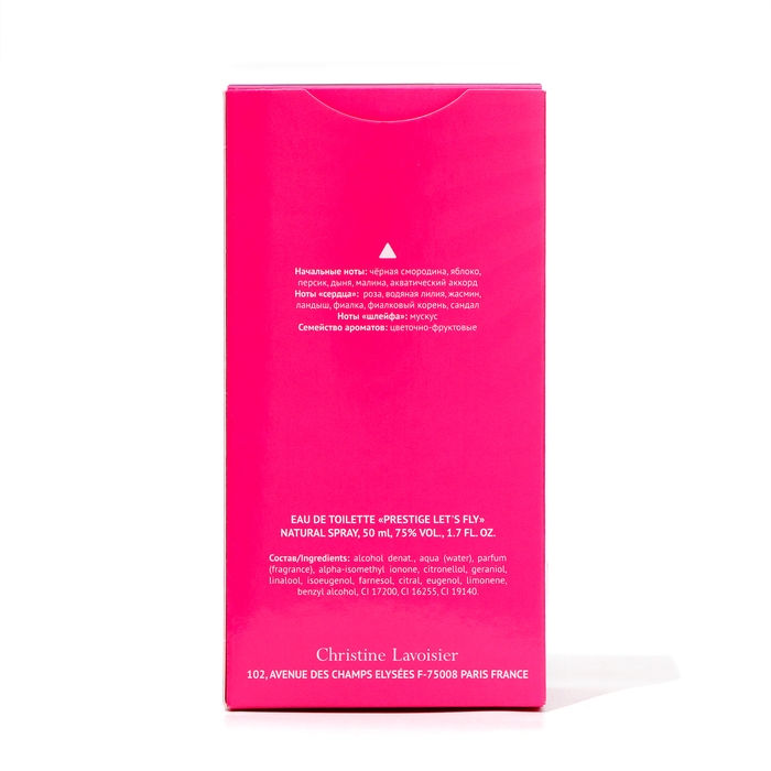 LET’S Fly – яркое воплощение вашего оптимизма, легкости и очарования!Пропитанный лучами света, каждое мгновение он наполнит наслаждением, подарит ощущение полета и свободу двигаться навстречу мечте!Восхитительное звучание фруктово-ягодного коктейля из нот черной смородины, яблока, персика, дыни и малины сменяется окрыляющей нежностью цветочного флера из розы, жасмина, ландыша и фиалки. Завершающий аккорд мускуса мягко сливается с ароматом вашей кожи, вызывая восторг у окружающих своим изяществом.