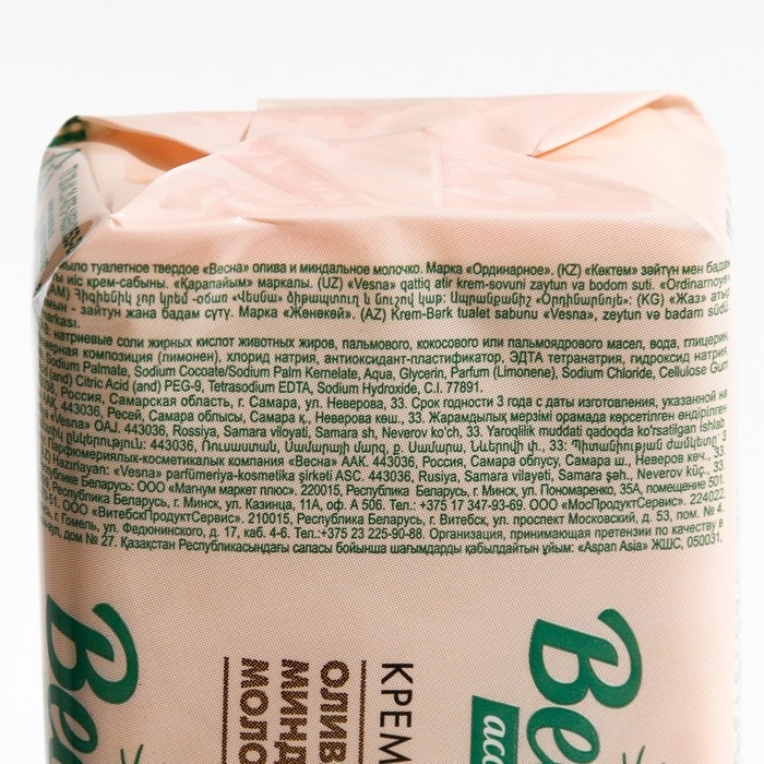 Туалетное мыло ВЕСНА, Олива и миндальное молочко. Бархатистая текстура мыла легко вспенивается и деликатно очищает кожу, окутывая её нежным ароматом. Нежная пена с легкостью смывается водой, позволяя коже дышать.