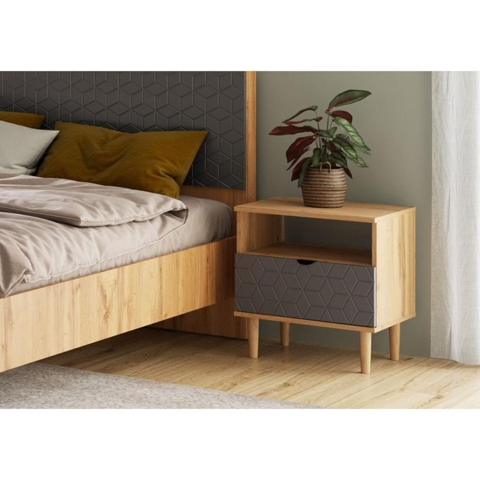 Тумба "Денвер" – создаст в спальной комнате теплую и уютную атмосферу. Она оснащена открытой полкой и выдвижным ящиком, благодаря которому, можно организовать пространство для организации ваших вещей и поддержания порядка. Фасад тумбы декорирован фигурной фрезеровкой, в виде кубов, создавая зрительно расширяющей пространство. Практичная, компактная модель с лёгкостью дополнит любой интерьер и организует пространство для хранения личных вещей.
