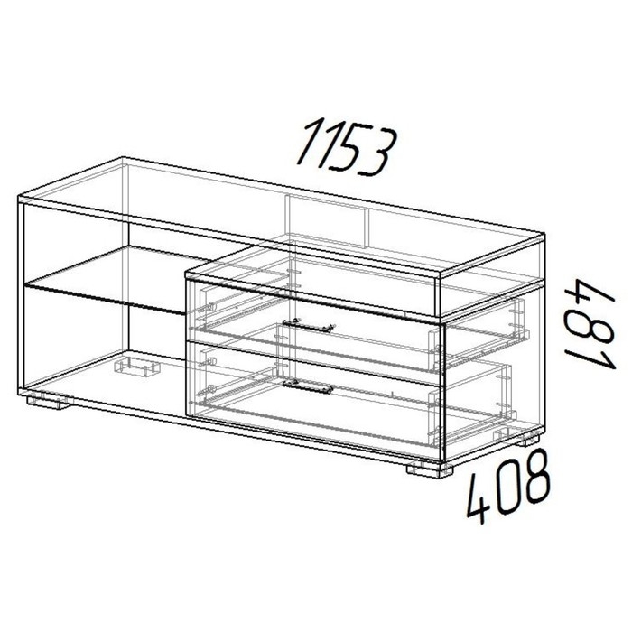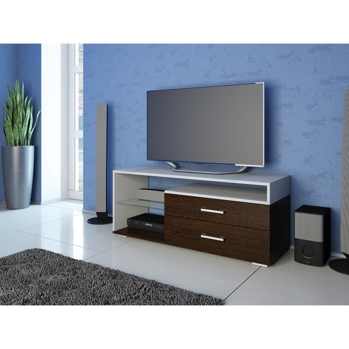Тумба под ТВ состоит из широкой подставки для монитора, двух вместительных выдвижных ящичков и полочек, которые смогут разместить необходимые детали интерьера. Лёгкий дизайн привлекает внимание своей ненавязчивостью. Модель прекрасно дополнит интерьер в классическом стиле, а вариант с контрастными цветами украсит комнату в стиле модерн.