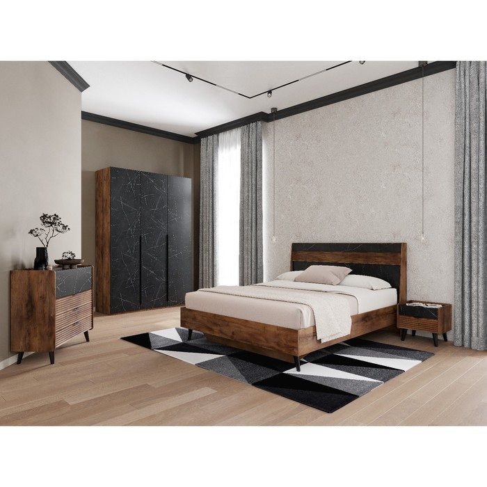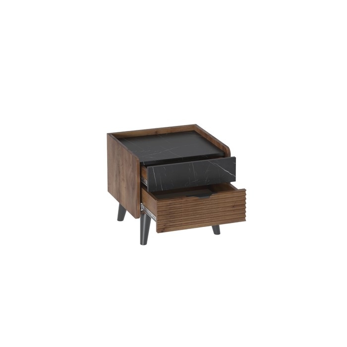 Тумба прикроватная «Браун» - стильное решение, создать в вашей спальной комнате, уют и комфорт, в стиле Лофт. Это функциональная модель, оснащена на высоких ножках и двумя выдвижными ящиками, способствуя оптимальному решению, организовать пространство для удобного хранения личных вещей. Первый ящик, представлен в цвете Мрамор нери, а нижний ящик, в цвете таксония и, выполнен с фрезеровкой, тем самым дополняя, дизайн в стиле Лофт.