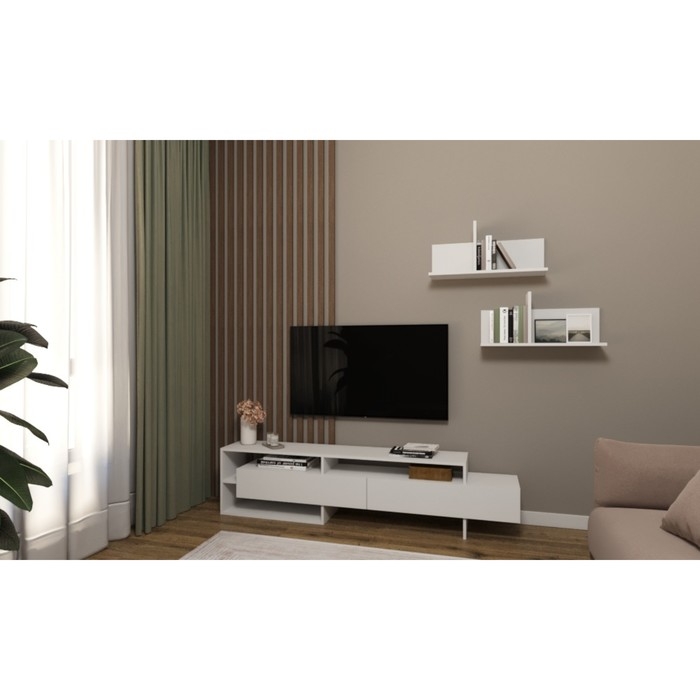 Тумба ТВ 1, 1800*300*420 - стильная и вместительная тумба под ТВ, подходит для современного лаконичного интерьера. В двух закрытых нишах всегда под рукой необходимые вещи, а на полки можно поставить различные декоративные мелочи.