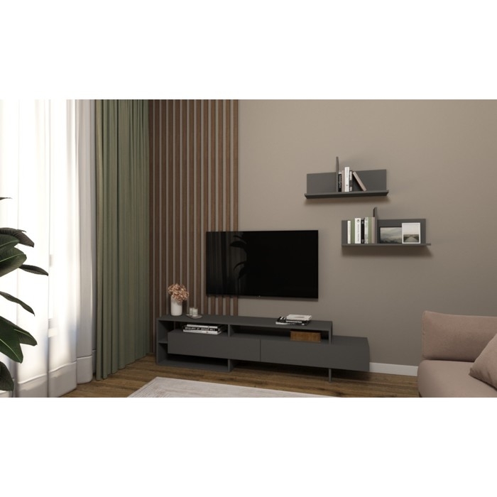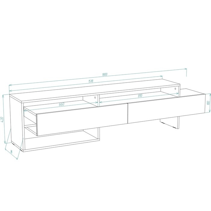 Тумба ТВ 1, 1800*300*420 - стильная и вместительная тумба под ТВ, подходит для современного лаконичного интерьера. В двух закрытых нишах всегда под рукой необходимые вещи, а на полки можно поставить различные декоративные мелочи.