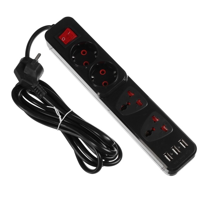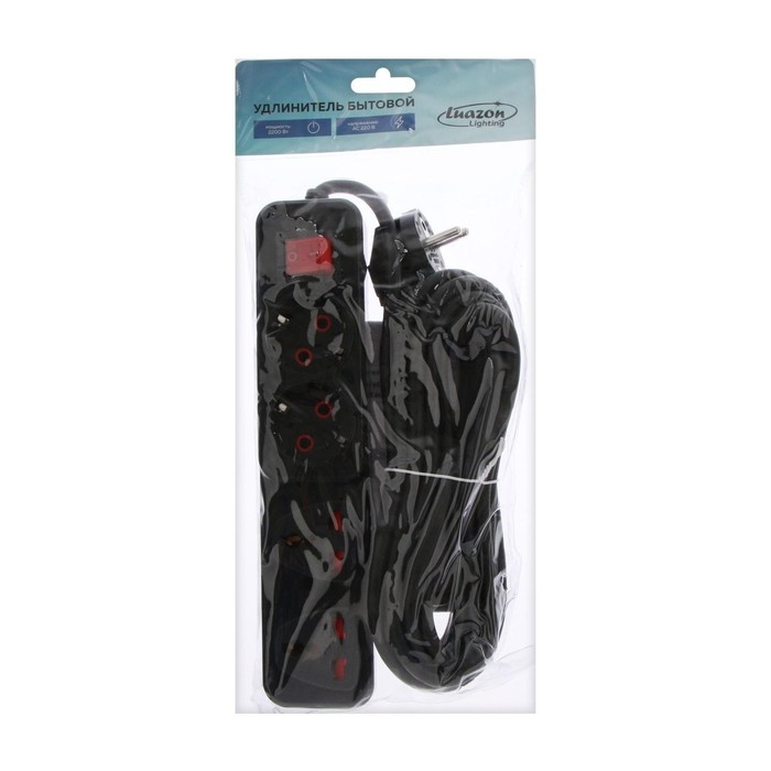 Удлинитель Luazon Lighting, 2 евро+2 унив.роз., 3 м,2200Вт, 2х0.75 мм2, 3хUSB, с выключателем, чёрный