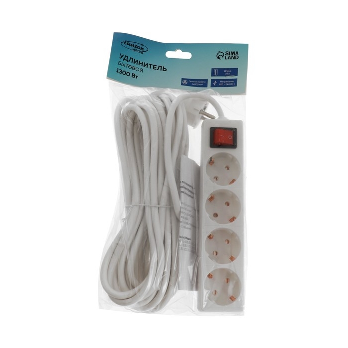 Удлинитель Luazon Lighting, 4 розетки, 10 м, 6 А, 1300 Вт, 3х0.75 мм2, с з/к, с выкл., Б