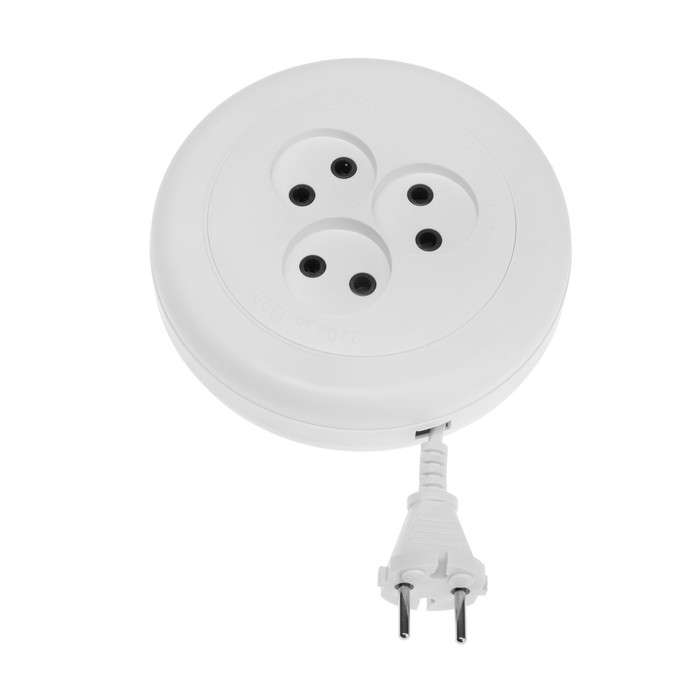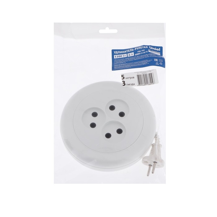 Удлинитель-рулетка Uniel, 3 розетки, 5 м, 6 А, 1300 Вт, ШВВП 2х0.75 мм2, без з/к, белый