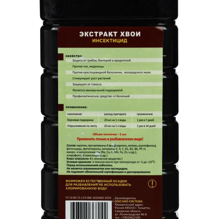 Экстракт хвойных деревьев с богатым составом биологически активных веществ. Отпугивает вредителей, защищает от болезней.