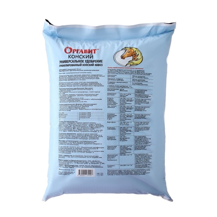 Органическое гранулированное удобрение ОРГАВИТ специально предназначено для садоводов, фермеров. Удобрение производится на основе сухого конского навоза.Значительным преимуществом удобрения ОРГАВИТ является его экологическая безопасность. Навоз подвергнут высокотемпературной обработке, которая надёжно обеззараживает, обезвреживает от возбудителей инфекционных, инвазионных заболеваний. Хранение удобрения ОРГАВИТ не сопровождается заметными потерями биогенных элементов.Гранулированная форма Оргавит Конский в почве в период засухи сохраняет влагу, медленно отдаёт её растениям, микроорганизмам, создаёт более благоприятные условия для формирования урожая. Преимуществом гранулированной формы удобрения ОРГАВИТ также является возможность его локального, более эффективного, менее затратного внесения. Гранулированная форма обеспечивает равномерность внесения удобрения ОРГАВИТ, длительное его пролонгирующее действие.Удобрение ОРГАВИТ содержит в оптимальном соотношении все необходимые для роста растений макро и микроэлементы, разнообразные аминокислоты, витамины, фитогормоны и прочие соединения, способствующие более полному раскрытию их генетического потенциала.Гарантирует отличную приживаемость рассады, повышает темпы её роста и развития. Усиливает регенерационные процессы, увеличивает сопротивляемость растений к бактериальным и грибным заболеваниям (особенно, мучнистой росе, корневым гнилям, чёрной ножке и др.), улучшает адаптацию к колебаниям температуры, влажности почвы. Олигосахариды в составе удобрения стимулируют развитие мощной корневой системы растений, повышают урожайность, качество продукции, ускоряют созревание плодов, улучшают их лёжкость при хранении.Удобрение не содержит веществ искусственного происхождения, безопасно для окружающей среды, теплокровных животных, птиц, рыб, насекомых.Удобрение легко усваивается растениями, применяется на всех типах почв, под любые овощные, зеленные, плодово-ягодные, цветочные, декоративные культуры, газонные травы.1 чайная ложка удобрения -- 6 г1 столовая ложка удобрения -- 15 г Удобрения Оргавит можно применять как в сухой гранулированной форме под перекопку, так и в жидкой форме в виде суспензии. При использовании удобрения Оргавит неприятные запахи, присущие органическим удобрениям, полностью отсутствуют, что дает возможность комфортного использования как в саду и огороде, так и в домашних условиях.Чтобы приготовить жидкую подкормку (суспензию), нужно растворить гранулы в воде. Гранулы удобрения Оргавит через 15 минут полностью распадаются, не образуя плавающих комков. Желательно образовавшуюся суспензию настоять от 4 часов до 2 суток. Если вы используете Оргавит в домашних условиях для комнатных растений, то можно его применять через 40 минут. Перед употреблением обязательно перемешайте суспензию до однородного раствора и полейте растения соответственно дозировке.