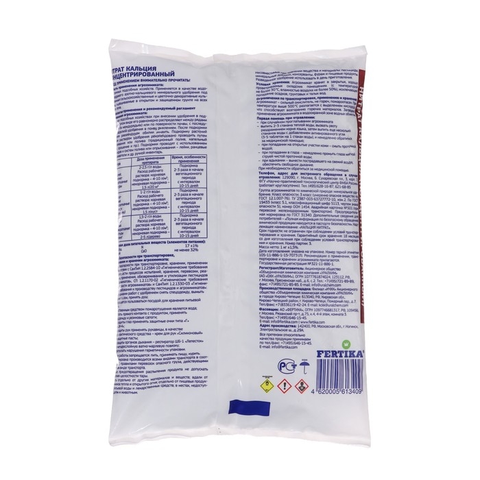 Двухкомпонентное водорастворимое удобрениеСодержит доступный азот и в повышенном количестве растворимый кальцийРекомендуется для подкормки овощных и плодовых культурСпособствует наращиванию вегетативной массы, формированию и укреплению скелетных тканей растенийУлучшает лежкость овощей и фруктов при храненииПри длительном использовании снижает кислотность и улучшает физические свойства почвыПрепятствует появлению вершинной гнили у томатов и перцевНе содержит хлорПовышение урожайностиБольшое содержание полезных веществОтсутствие в составе хлораБезопасность примененияНормы и способы внесенияОвощные, цветочно-декоративные культуры 2-2,5 г/л воды.Расход рабочего раствора: корневая подкормка - 4-10 г/м2; некорневая подкормка - 1,5 л/20 м2 Подкормка 2-3 раза в начале вегетационного периода с интервалом 10-15 днейПлодово-ягодные и декоративные культуры (кустарники) 1-2 г/л воды.Расход рабочего раствора: корневая подкормка - 4-10 л/м2; некорневая подкормка - 1,5 л/куст Подкормка 2-3 раза в начале вегетационного периода с интервалом 10-15 днейПлодово-ягодные и декоративные культуры (деревья) 1,5-2 г/л воды.Расход рабочего раствора: корневая подкормка - 4-10 л/м2; некорневая подкормка - 2-5 л/деревоПодкормка 2-3 раза в начале вегетационного периода с интервалом 10-15 дней