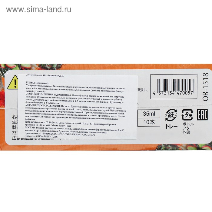 Удобрение японское FUJIMA, для кактусов и суккулентов, оранжевый, набор 10 шт. по 35 мл