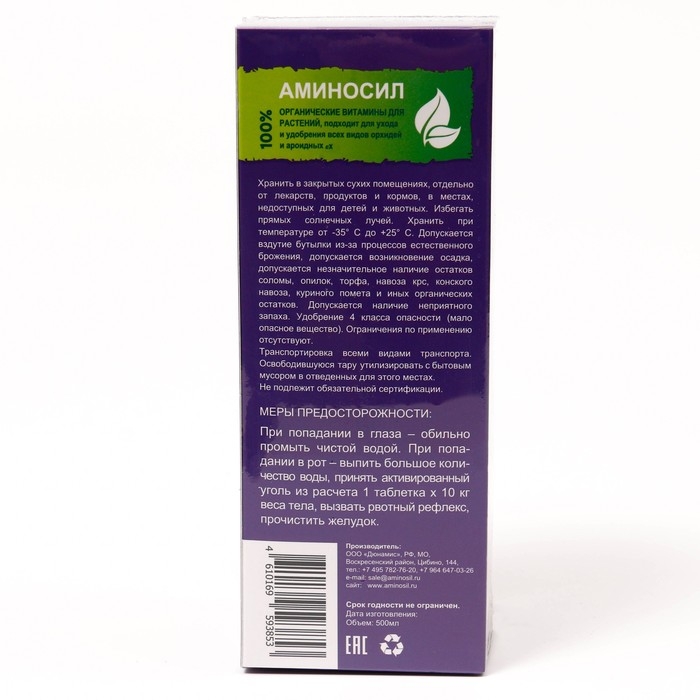 Полный комплекс витаминов для орхидей создан для полноценного сбалансированного питания всех типов орхидей. Подкормка для орхидей , 100% органический состав.Благодаря микро и макро-элементам органического происхождения Аминосил дарит орхидеям длительное и интенсивное цветение, а так же обеспечивает качественный рост и развитие растения.Удобрение для цветов Аминосил принимают активное участие в процессе метаболизма растений. По сути, они представляют собой элементы или кирпичики, благодаря которыми происходит строительство растительных клеток.Перед удобрением полейте культуру обессоленной (кипяченой или фильтрованной) водой.Расход: 5 мл АМИНОСИЛ разбавить в 2 л воды до образования однородного раствора.Вариант 1: поливать растение получившимся раствором ближе к основанию в горшке до полного намокания субстрата/грунта и корней.Вариант 2: опрыскивать растение получившимся раствором до полного смачивания листьев или протирать листья смоченной раствором салфеткой. Избегать попадания на бутоны и лепестки цветов.Периодичность: подкармливать растения 1 раз в 2 недели в активный период и 1 раз в 4 недели в период покоя.Регулярное использование АМИНОСИЛ обеспечит обильное цветение и здоровье вашего цветка надолго!Важно: нельзя поливать растения слитой подкормкой повторно, раствор изменяет свои свойства и может содержать вымытые грибки и болезни.Насыщает растение, субстрат и почву всеми необходимыми витаминами;Укрепляет здоровье и иммунитет растения.