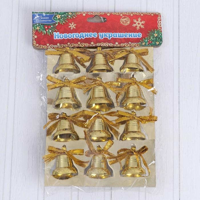 Украшение ёлочное "Колокольчики с бантиком и снежинками" (набор 12 шт) 2 см, золото