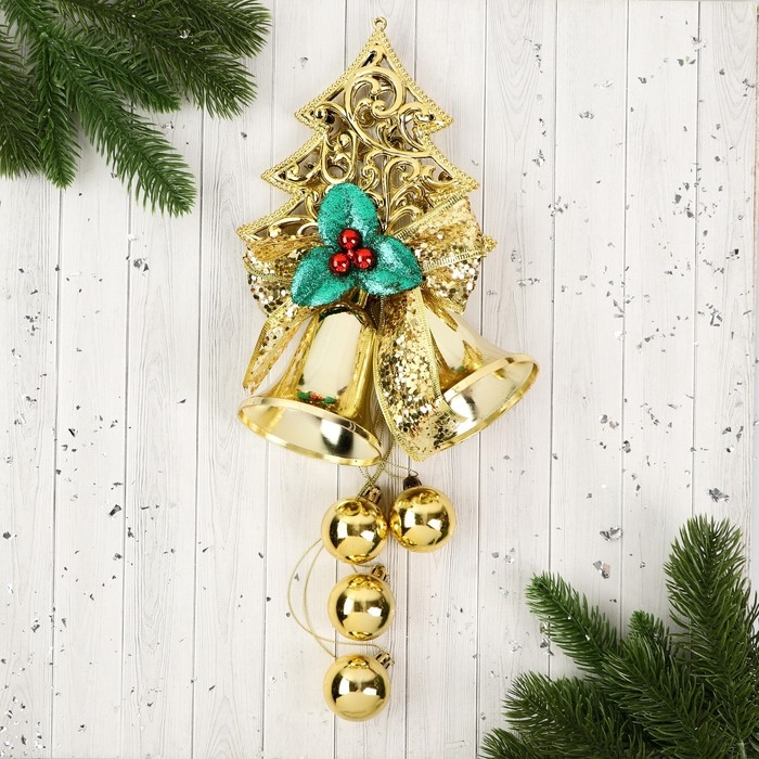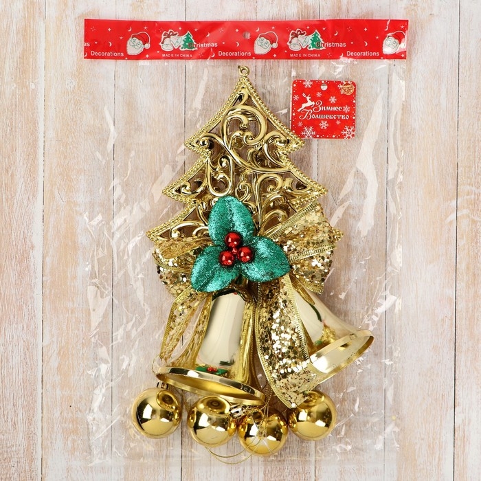 Украшение новогоднее "Уютная сказка" ёлка и колокольчики с зеленью14х37 см, золото