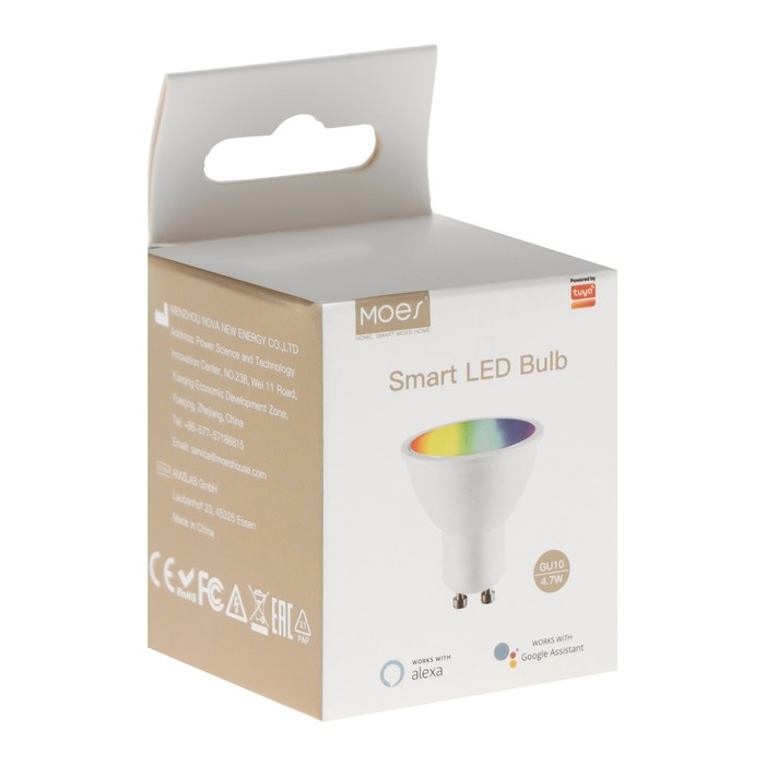Модель оснащена функцией RGB-подсветки. Работает в экосистеме Google Assistant. Корпус выполнен из прочного пластика. В качестве протокола беспроводной связи используется Wi-Fi. Тип цоколя - GU10. Можно подключить лампу к системам голосового управления Google Assistant и Amazon Alexa.