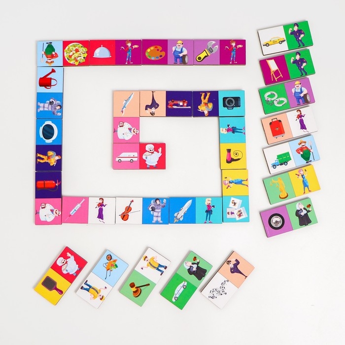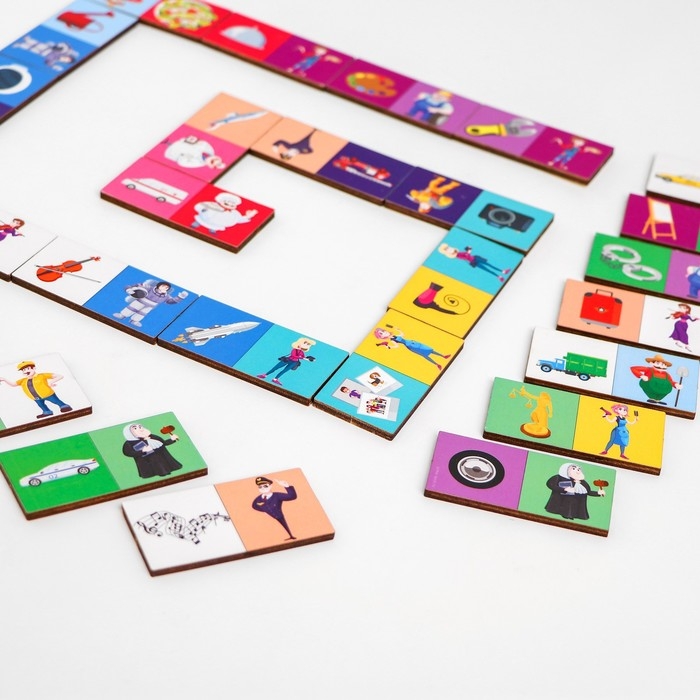 Участвуют от 2 до 4 человек. Если игроков двое, они получают по 7 фишек, если больше — по 5. Начинайте выкладывать элементы с дублей, а затем по очереди все участники должны добавлять с любого края совпадающие по картинке фишки. Если подходящих не оказалось, дополнительная берётся из «банка», пока не найдётся нужная, или пропускается ход. Побеждает тот, кто быстрее всех выложит все свои фишки.