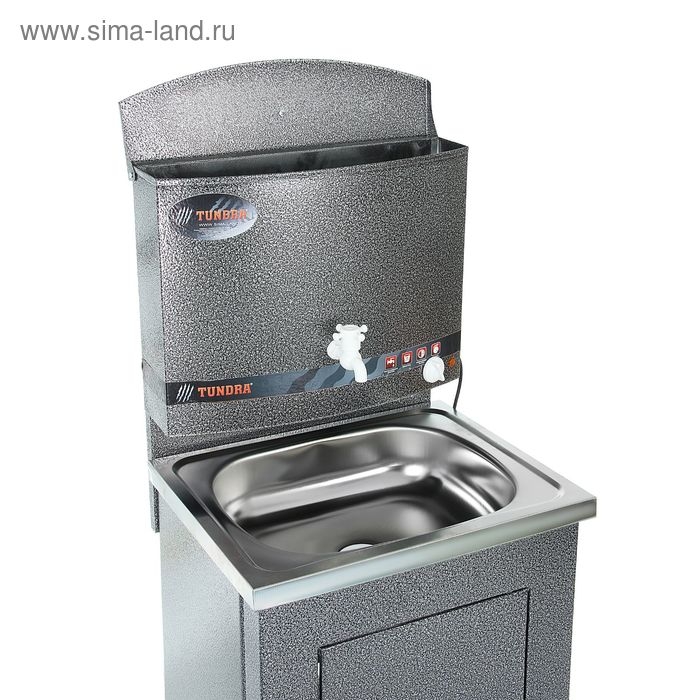 Умывальник TUNDRA — отличное приобретение для дачи, гаража, мастерской или других мест без центрального водоснабжения. Металлическая конструкция серебряного цвета проста в эксплуатации и уходе, обладает высокой износоустойчивостью. Раковина выполнена из нержавеющей стали, а на бак для воды нанесено запатентованное устойчивое к коррозии покрытие. Огромное преимущество — наличие встроенного водонагревателя, который будет особенно актуален в прохладную погоду.
