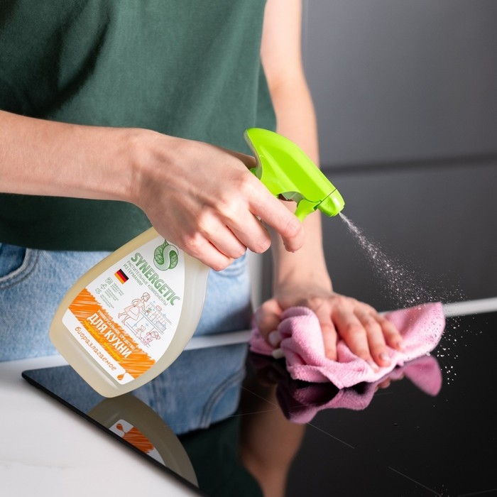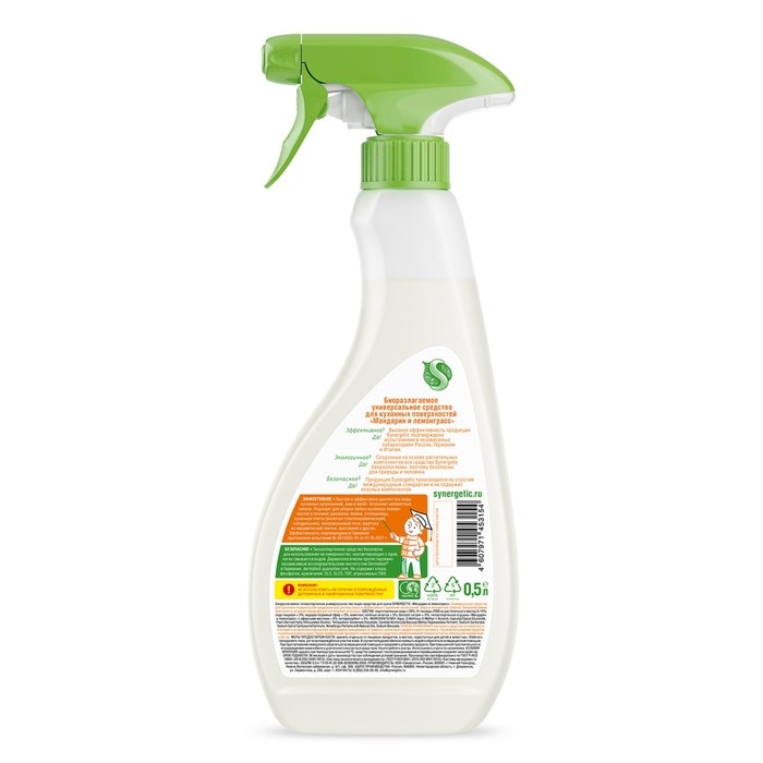 Универсальный чистящий спрей для уборки кухонных поверхностей SYNERGETIC с ароматом "Мандарин и лемонграсс" быстро и эффективно удаляет все виды кухонных загрязнений, жир и налет, устраняет неприятные запахи.