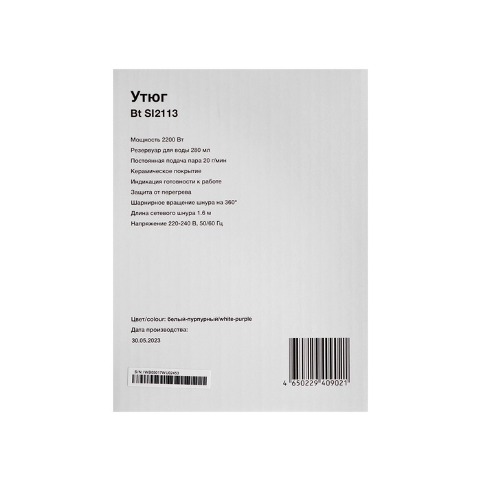 Утюг Blackton Bt SI2113, керамическая подошва, 2200 Вт, 20 г/мин, 280 мл, бело-фиолетовый