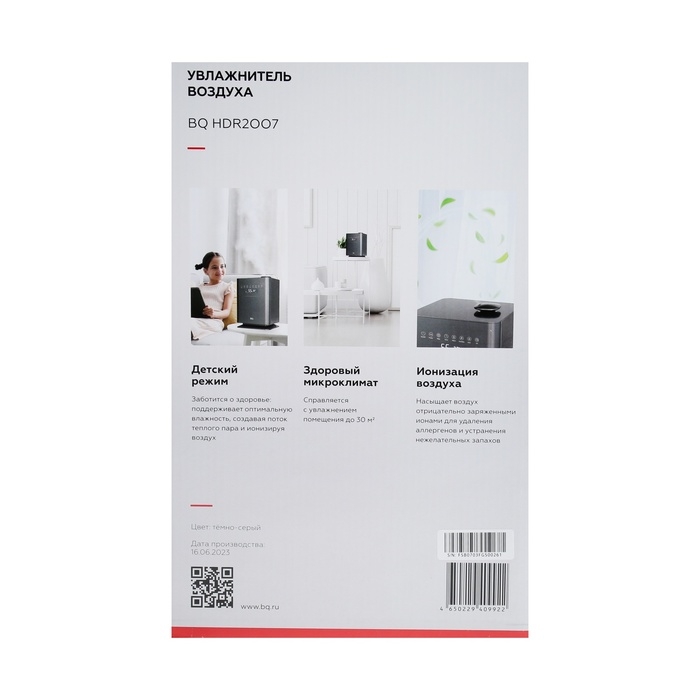 Увлажнитель воздуха BQ HDR2007, ультразвуковой, 30 Вт, 4.3 л, до 30 м2, серый