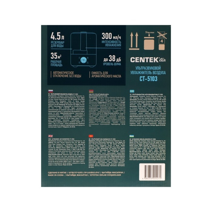 Увлажнитель воздуха Centek СТ-5103, ультразвуковой, 25 Вт, 4.5 л, до 35 м2, зелёный