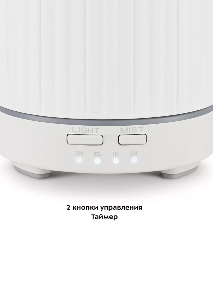 У устройства простое и легкое управление двумя кнопками. Увлажнитель имеет два режима подачи тумана: непрерывный и импульсный. В импульсном режиме подача тумана будет циклически включаться на 15 секунд, затем выключаться на 15 секунд. Есть возможность включить таймер на 1 или 3 часа, в течение этого времени устройство будет работать в непрерывном режиме. Можно включить подсветку с плавной сменой цветов или выбрать один цвет подсветки. Устройство можно использовать как ночник, не включая подачу тумана.