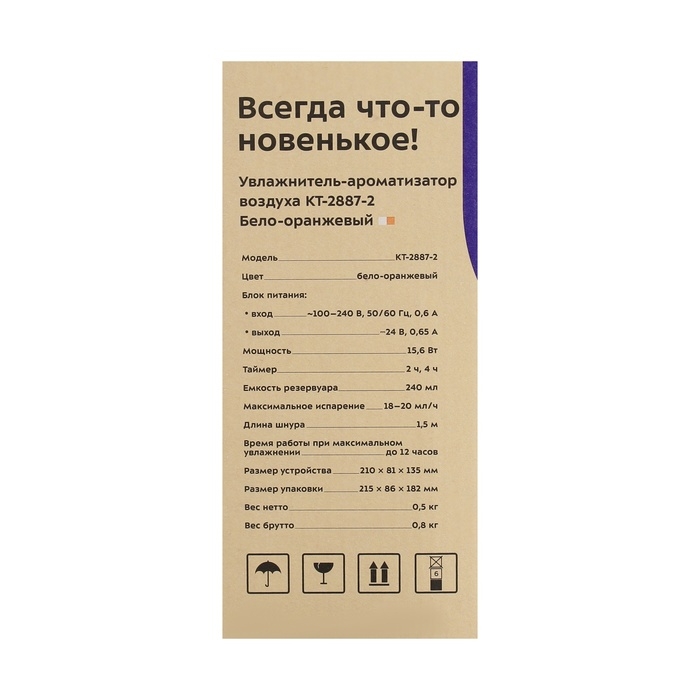Увлажнитель воздуха Kitfort КТ-2887-2, ультразвуковой, 15.6 Вт, 0.24 л, оранжево-белый