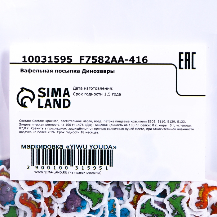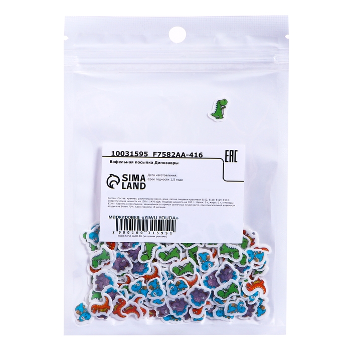 Вафельная кондитерская посыпка "Динозавры" - это односторонние съедобные украшения домашней и профессиональной выпечки. Съедобные украшения для кондитерских изделий не нужно вырезать, они уже полностью готовы к использованию. Вафельное украшение в форме динозавров можно использовать для украшения торта, выпечки, кулича, пряников, пирожных, капкейков и любых других кондитерских изделий. Не имеет вкуса и запаха, полностью съедобно. Рекомендуется украшать вафельными посыпками непосредственно перед подачей блюд.