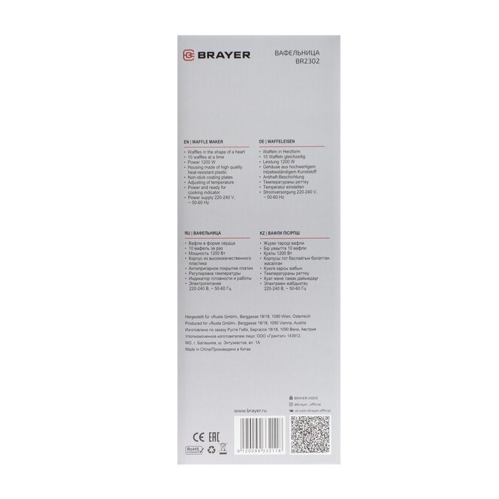 Вафельница BRAYER 2302BR, 1200 Вт, форма сердца, антипригарное покрытие