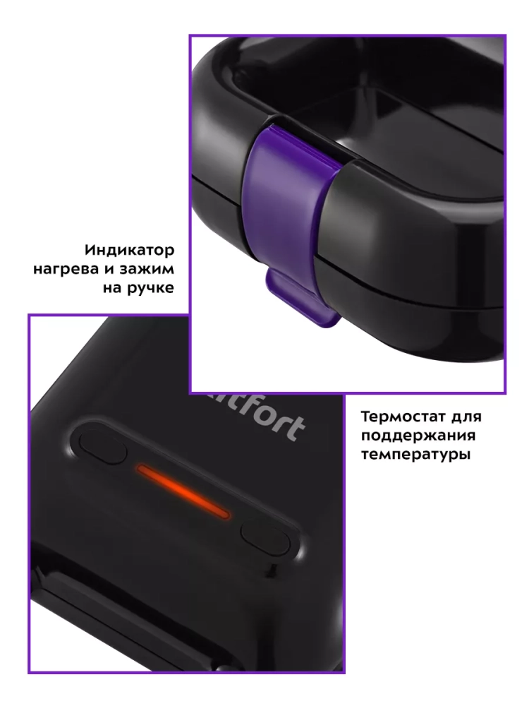 Антипригарное покрытие не дает прилипнуть тесту в процессе приготовления и позволяет готовить с минимальным количеством масла или без него. Также антипригарное покрытие облегчает чистку панелей. Вафельница оснащена индикатором нагрева, а также термостатом для поддержания температуры панелей.