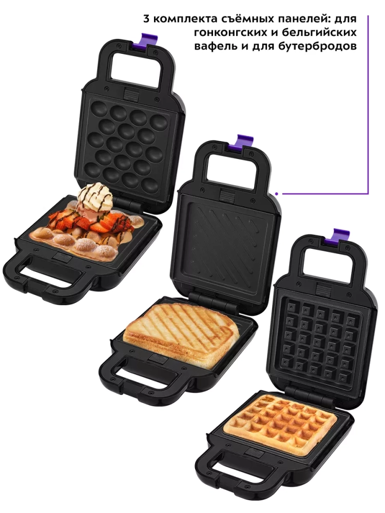 Электрическая вафельница Kitfort КТ-3609 поможет испечь бельгийские и гонконгские вафли, а также приготовить бутерброды или продукты на гриле. Для этого в комплекте предусмотрены три пары съемных панелей.