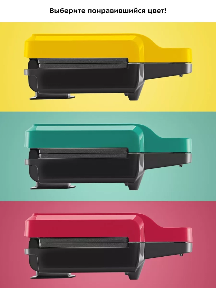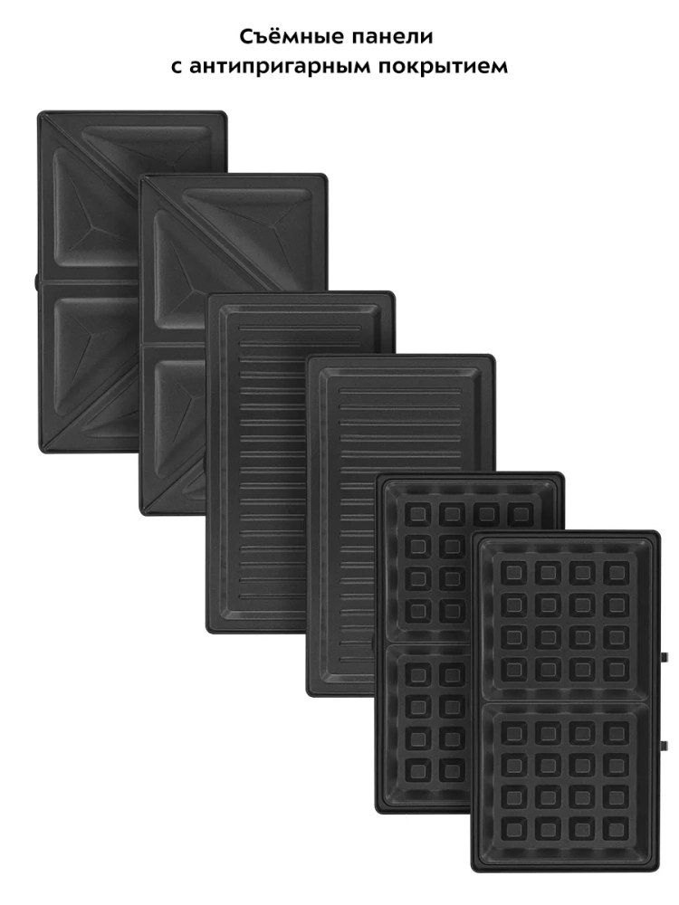У прибора три пары панелей: панели для приготовления вафель, панели для приготовления бутербродов и ребристые панели для гриля. Высокая температура панелей способствует быстрому приготовлению продуктов. Для удобства ухода панели сделаны съемными — их можно мыть под проточной водой.