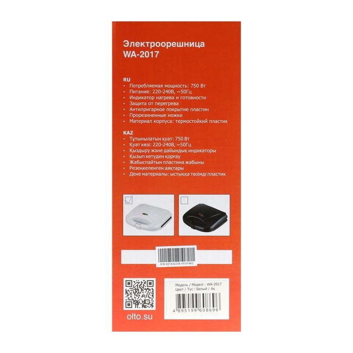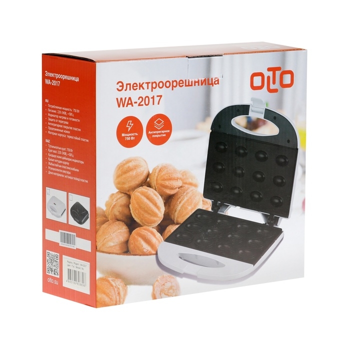 Вафельница электрическая OLTO WA-2017, 750 Вт, орешки, антипригарное покрытие, белая