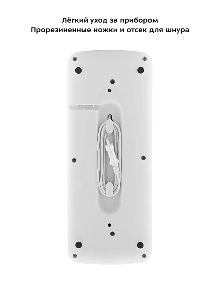 Контейнер для жидкости можно легко снять и очистить. Прорезиненные ножки делают устройство более устойчивым и не дают скользить по столу во время работы. Также на дне устройства есть отсек для хранения шнура питания.
